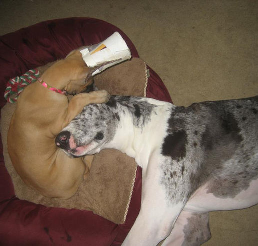 We took Lilly in when her owner couldn't keep her. My daughter who always wanted a Dachshund, Yorkie or Chihuahua, begged me to rescue her and keep her. So With a bow around her neck, she became my daughter 's 150 pound baby. Bred by a backyard breeder,and a "Brindlequin", she opened many discussions on ethical breeding, and her sweet personality made her an advocate for the breed. She was my daughter's loyal friend, and a great member of our family. She also was a blood donor on more than one occasion in order to try to save other dogs lives. Lilly was also a big hit with kids during preschool tours at the veterinary clinic where I worked.